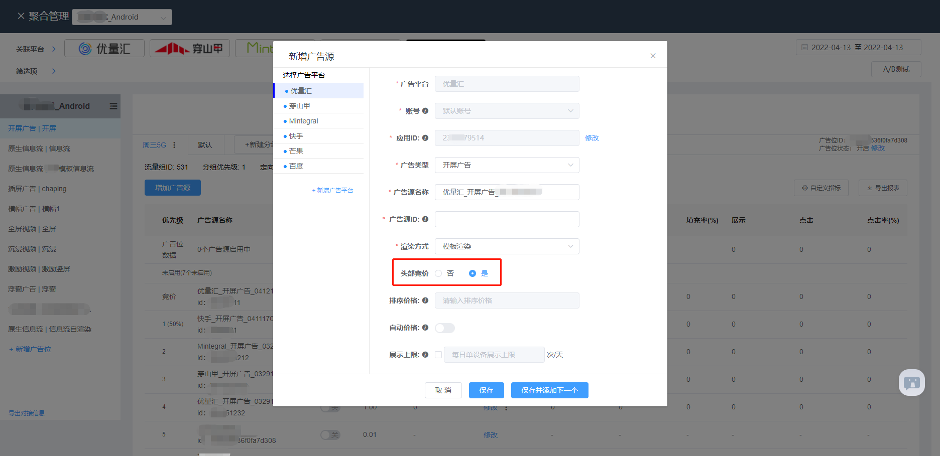 对于支持头部竞价的广告平台,在平台中创建头部竞价广告位后,在聚合管理新增广告源配置中开通头部竞价功能即可。