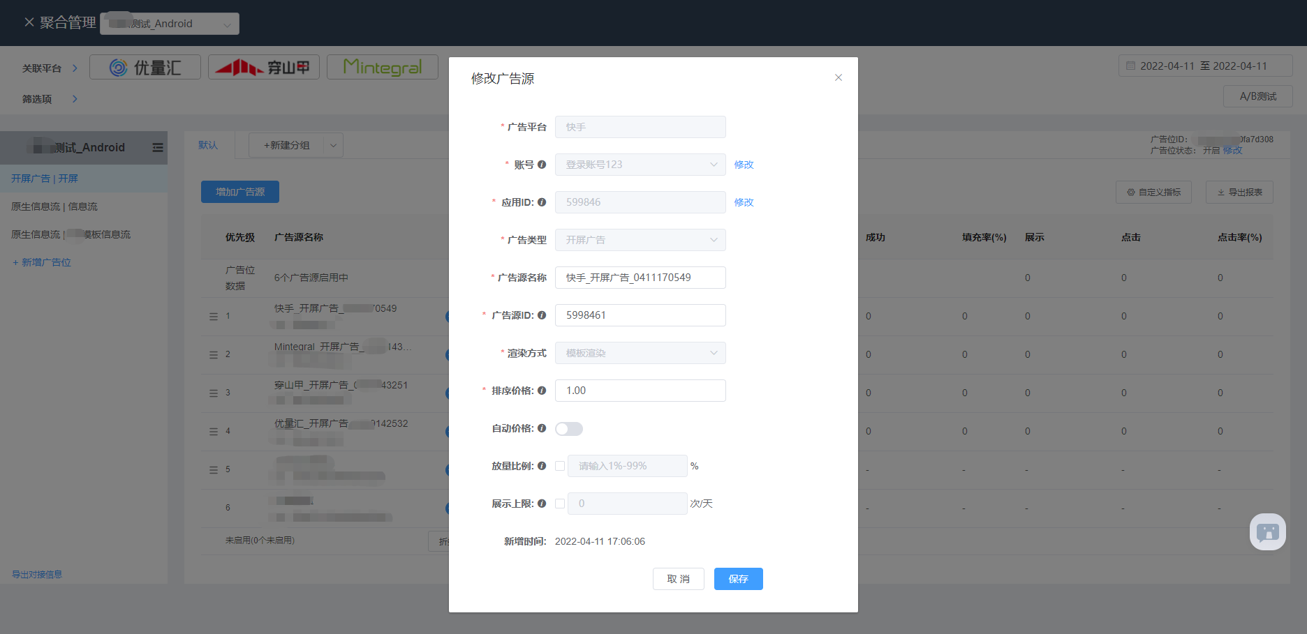 广告源添加成功后,在广告位聚合管理页面可进行修改或删除。